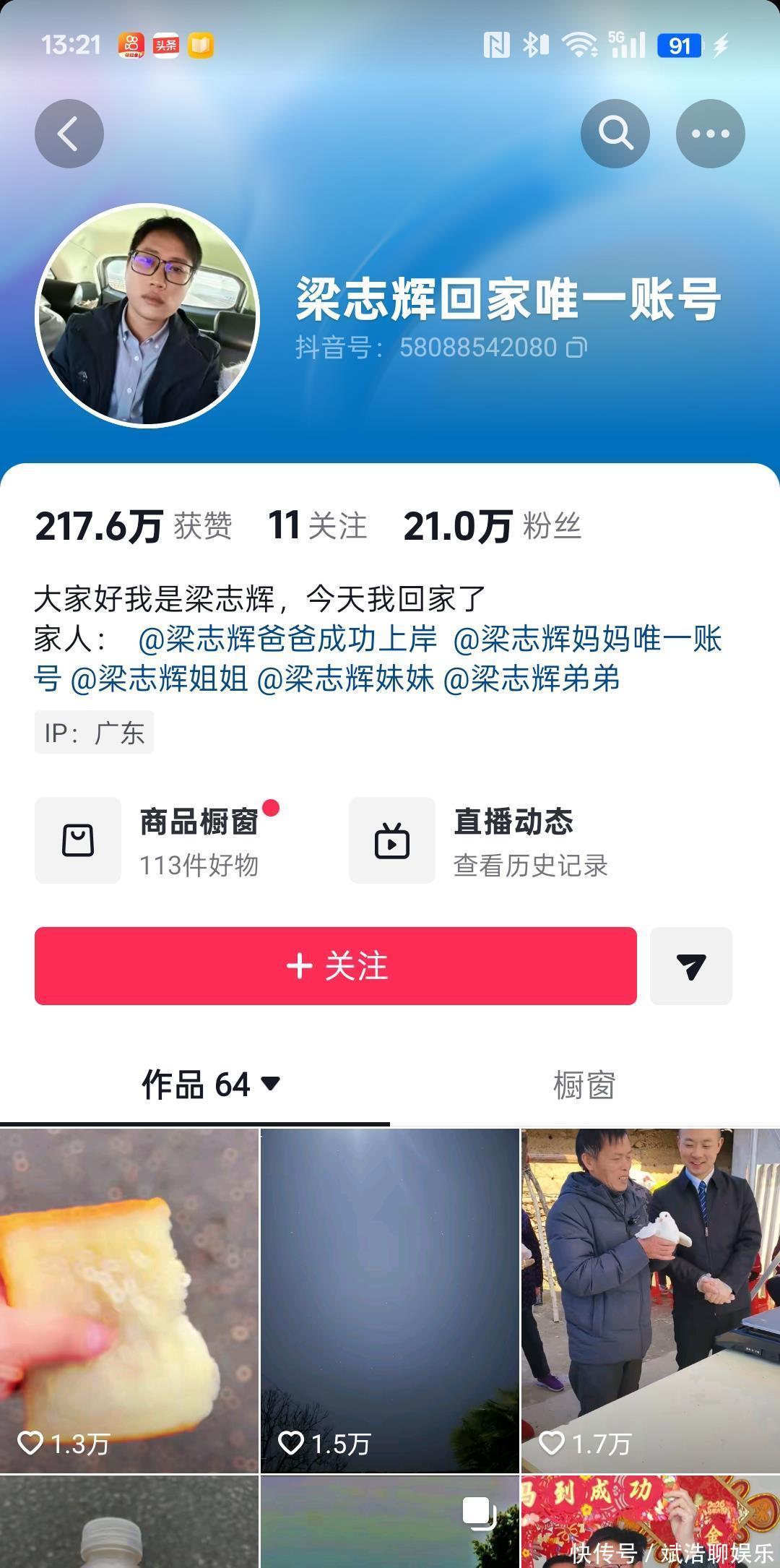 梁志辉的粉丝也涨到了21万,涨得不是很快,但是都是真的喜欢他的粉丝,主要是他说抖音内容也很真实,其实大家都喜欢真实的人。